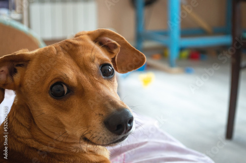 Cute face of a red dog of a small breed, with a devoted look directed at the camera. Indoor pet portrait.