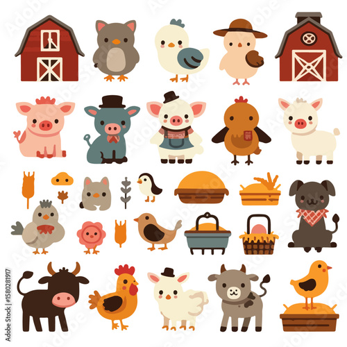 farm animal, chicken, pig, cow, calf, bird, farmhouse, cartoon, animal, dog, set, vector, animal, cat, illustration, bear, pet, rabbit, funny, collection, icon, baby, character, elephant, fun, zoo, lion, tiger, art, cute, comic