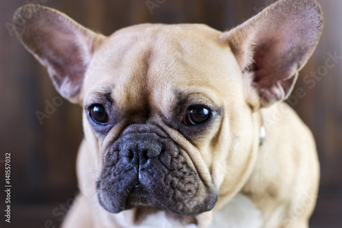 Cute fawn funny dog breed french bulldog sitting on a wooden brown rustic background, close-up