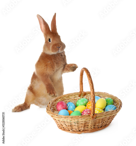 Cute fluffy rabbit and colorful Easter eggs isolated on white