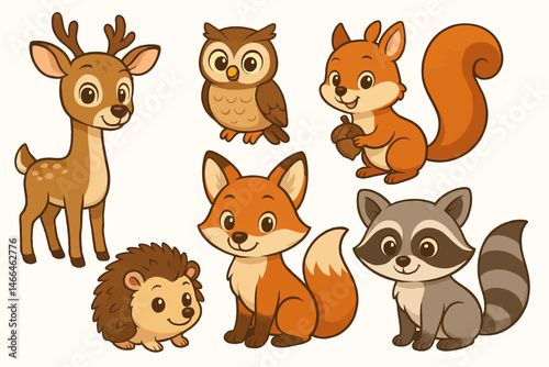 animal, forest, cartoon, cute, cervid, owl, fox, raccoon, squirrel, hedgehog, wildlife, nature, timberland, illustration, vector, character, children, children, friendly, smiling, antler, acorn, fur, fluffy, playful, creature, adorable, illustrated, happy, graphic, baby, stylised, icon