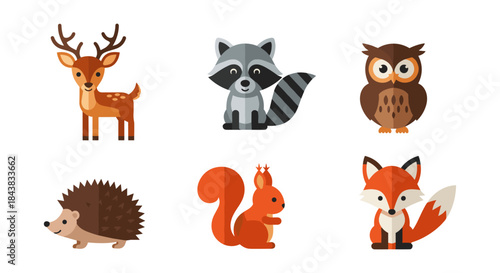 flat, cute, animal, forest, cervid, raccoon, owl, hedgehog, squirrel, fox, timberland, wildlife, cartoon, design, nature, colourful, simple, character, illustration, vector, fauna, creature, wild, adorable, mammal, isolated, fun, playful, modern, graphic, art, decorative, diverse, vibrant, cheerful, charming