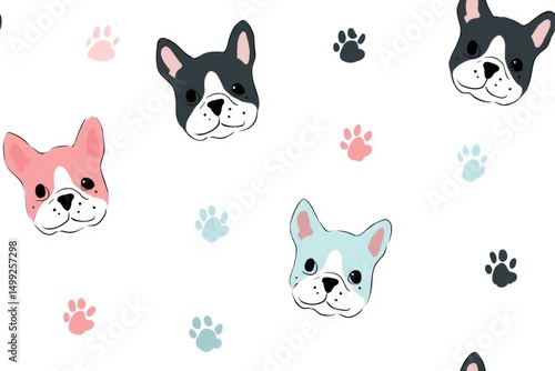 cartoon, animal, print, bulldog, whimsical, cute, colourful, simple, playful, repeat, print, repeating, pet, childcare center, children, face, graphic, paw, colours, french, pastel, adorable, art, illustration, seamless, background, dog, drawing, design, pattern, children