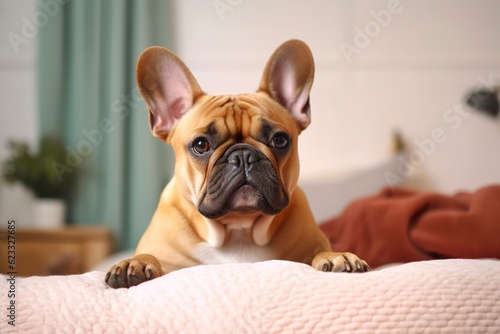 Cute French bulldog in a bedroom, closeup. AI Generative