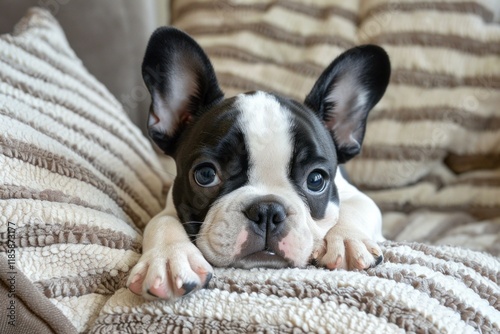 Cute french bulldog puppy resting on a comfortable cushion, enjoying a moment of peace