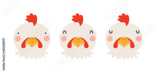 Cute funny chicken faces illustrations set. Hand drawn cartoon character. Scandinavian style flat design, isolated vector. Kids print element, poster, card, wildlife, nature, baby animals