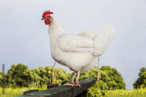 cute funny white chicken stands in the yard in the summer on a farm on the roost
