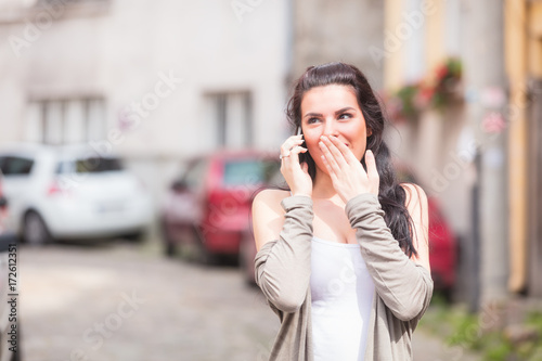 holding, city, urban, scene, female, woman, lady, mobile phone, phone, mobile, street, outdoors, hanging out, hipster, 20s, 1, girl, alone, using, summer, modern, person, young, smile, big smile, happy, cheerful, talking, on the phone, call, walking, attractive, cute, pretty, alley, car, shy