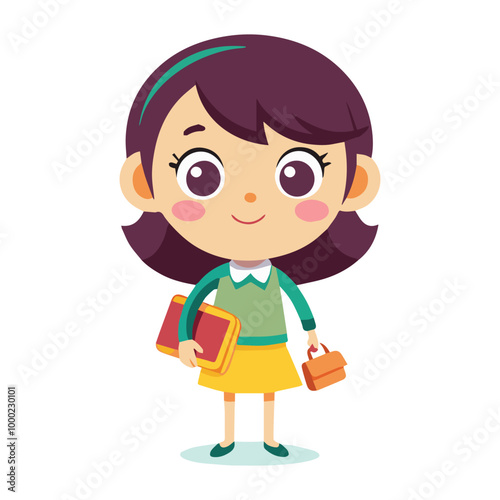 Cute Girl with Handbag and Book Cartoon Vector Icon Illustration on a White Background