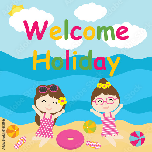 Cute girls are happy on holiday vector cartoon, Summer postcard, wallpaper, and greeting card, T-shirt design for kids
