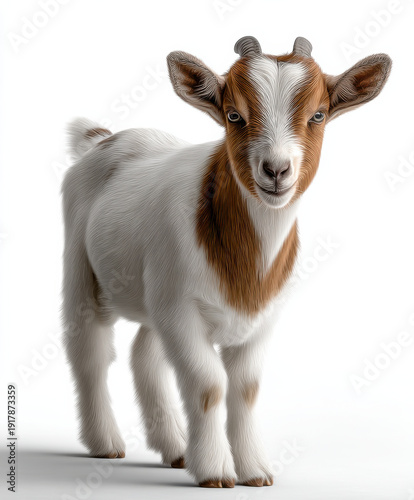 Cute goat brown white fur young animal standing natural light isolated livestock farm adorable mammal