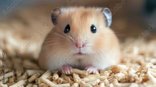 Cute Golden Hamster Portrait Sitting on Wood Shavings in Warm Light