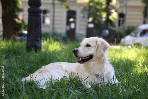Cute Golden Retriever dog resting on green grass