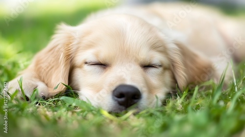 Cute golden retriever puppy sleeping peacefully on lush green grass outdoors : Generative AI