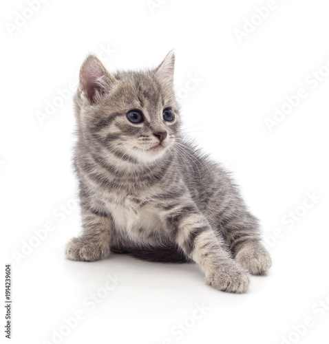 Cute grey tabby kitten sitting on a white background.