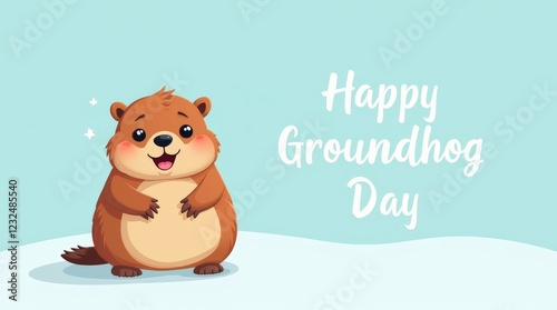 Cute groundhog on a light blue background with "Happy Groundhog Day" text.
