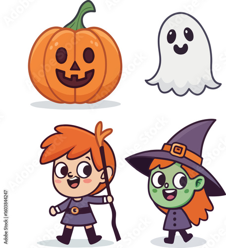 Cute Halloween Characters Pumpkin, Ghost, Witch and Child