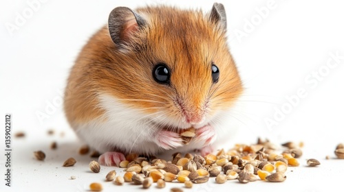 Cute hamster eating seeds on white background