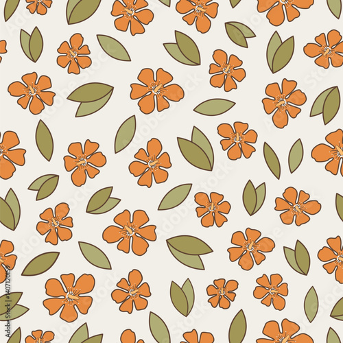 cute hand drawn orange flowers and green leaves seamless vector pattern background illustration