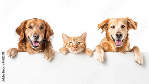 Cute, happy golden retriever, orange cat, and red dog peeking over the edge of a white banner on an isolated background