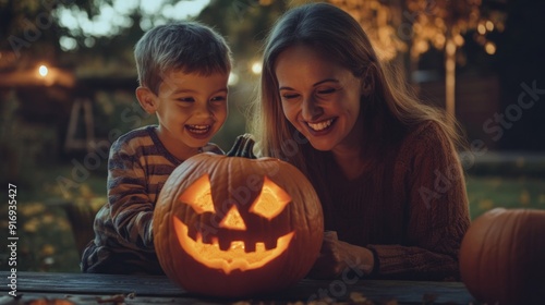 Cute happy little boy helping his mother to carve Halloween pumpkin at home and preparing for autumn holiday, family son and mom making Jack-o-Lantern together