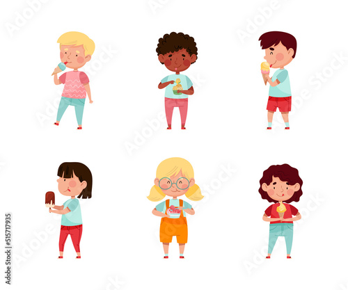 Cute happy little boys and girls enjoying of eating ice cream set vector illustration