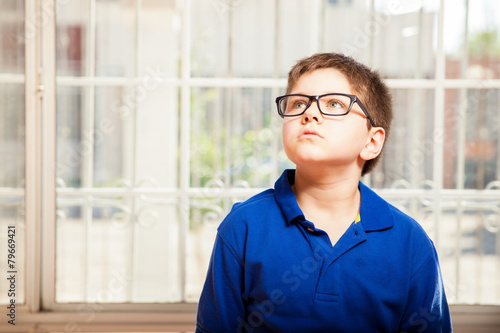 boy, little, children, children, childhood, young, tween, youngster, children, caucasian, blond, hispanic, latin, male, cute, portrait, lifestyle, indoor, home, living room, goggles, copy space, looking, daydreaming, idea, imagination, thinking