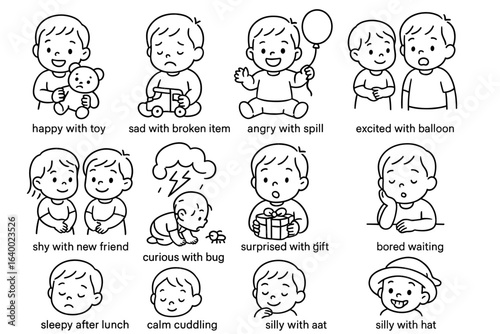 children, emotion, activity, line, art, happy, sad, angry, excited, shy, curious, surprised, bored, sleepy, calm, silly, toy, broken, spill, balloon, friends, bug, gift, waiting, lunch, cuddling, hat, drawing, cartoon, playful, expression, boy, girl, vector, icon