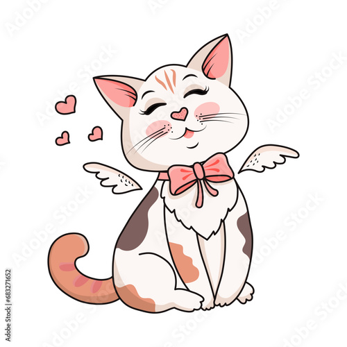 Cute kitty with angel wings and hearts. Vector illustration in kawaii style. Happy white kitten for Valentine's Day. Funny cat mascot.
