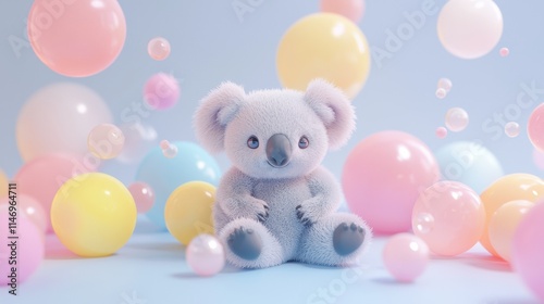 Cute koala teddy bear surrounded by colorful balls and bubbles in a playful setting