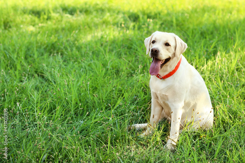 Cute Labrador dog sitting in park on sunny day