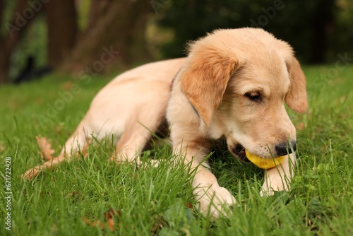 Cute Labrador Retriever puppy playing with ball on green grass in park