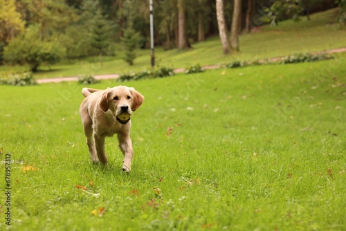 Cute Labrador Retriever puppy with ball running on green grass in park, space for text