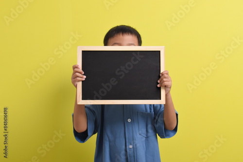 Cute little Asian boy holding blank chalk board, covering half of his face, isolated on yellow background. Space for text, copy space, banner mockup