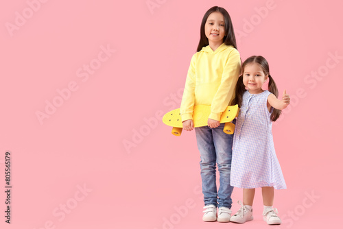 Cute little Asian happy sisters with skateboard showing thumb-up gesture on pink background