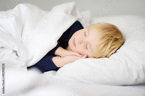 Cute little boy sleeping. Tired child taking a nap in parent's bed.