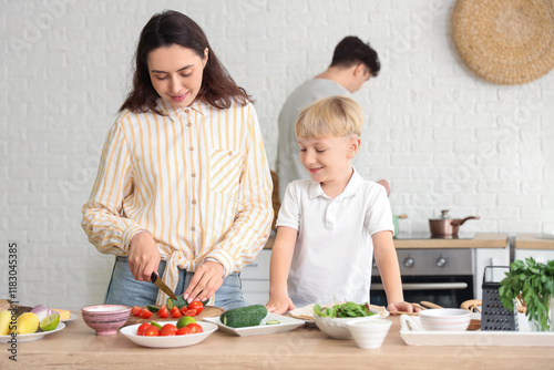 Cute little boy with his mother cutting tomato for Fajita in kitchen