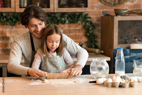 Cute little girl and her father in aprons rolling out the dough together on kitchen table, making cookies, free space