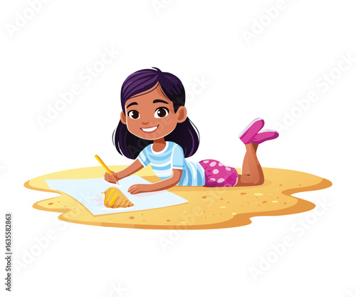 girl, children, children, drawing, artist, art, beach, sand, wax crayons, paper, happy, cute, little, creative, activity, summer, vacation, holiday, play, playing, leisure, cartoon, character, graphic, vector, illustration, person, people, figure, portrait, fun