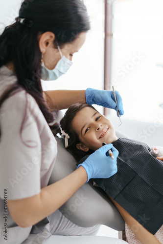 Cute little girl sitting on a modern dental chair and having dental consultation with dentist