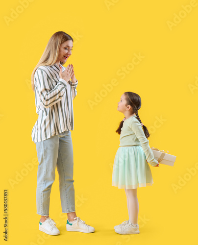 Cute little girl surprising her mother with gift on yellow background