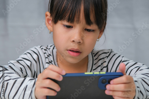 Cute little girl using smartphone and smiling while sitting at table in house. Happy Asian girl holding phone in hands, online learning or homeschooling, listening to music or playing games.