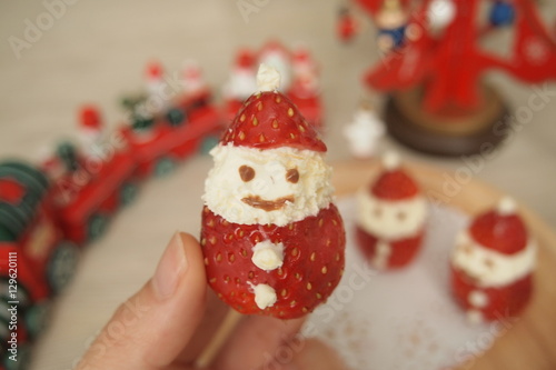 strawberry, santa, santa, whipped cream, cream, christmas, cute, red, christmas background, crafted, happy, little, tiny, idea, handcraft, homemade, celebration, sweet, dessert, dessert, children, train, toy, christmas tree, christmas dinner, high-coloured, festival, christmas party, party, meal