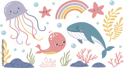 Cute marina life set with fish, whales, seaweed, marina elements for your design, childish hand drawn sea elements. playful and colorful vector illustration of cute underwater sea animals in a cartoon