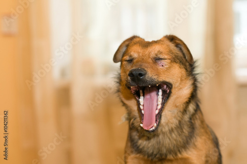 dog, pet, 1, home, interior, face, head, portrait, animal, mixed breed, red, orange, brown, black, window, curtain, open mouth, tongue, to sit, yawn, funny, cute, fun, teeth