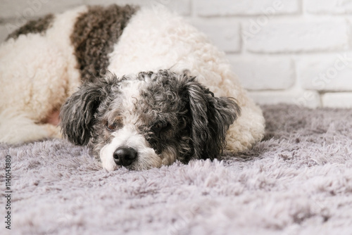 cute mixed breed terrier dog sitting on fluffy gray rug at home, white brick wall background