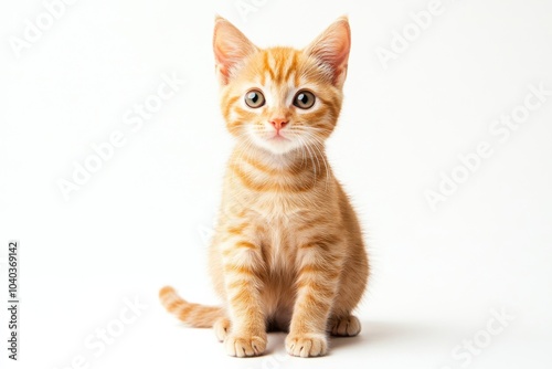 Cute orange tabby kitten sitting on white isolated background.