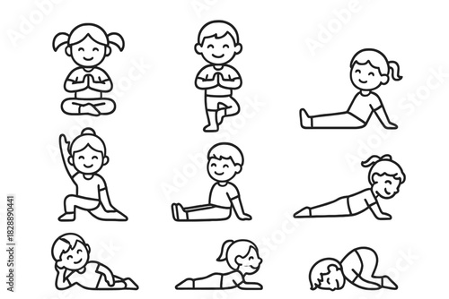 Cute outline drawing of children demonstrating various basic yoga and stretching exercises
