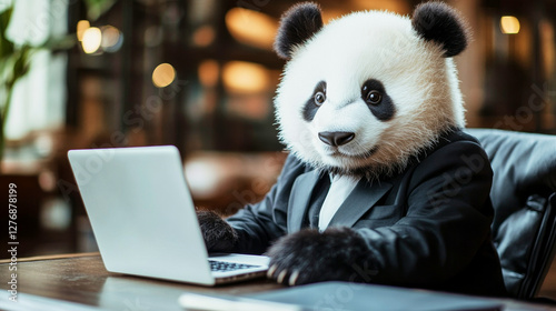 panda, business suit, laptop, office, desk, corporate, productivity, cute, animal, modern, work, environment, professional, sleek, stylish, sharpened, diligent, setting, adorable, office worker, fantasy, creativity, engaging, unique, dressed, technology, serene, charming, atmosphere, plush, corporate culture, humor, whimsical, entertaining
