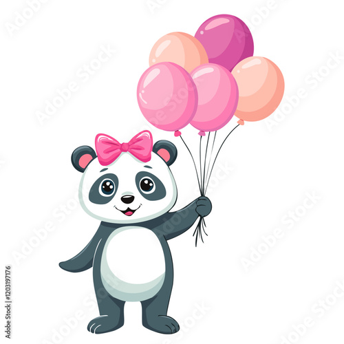 Cute panda with a bow on her head holds pink balloons in her hands vector illustration. Female character image for birthday greetings and cartoon style clothing print.